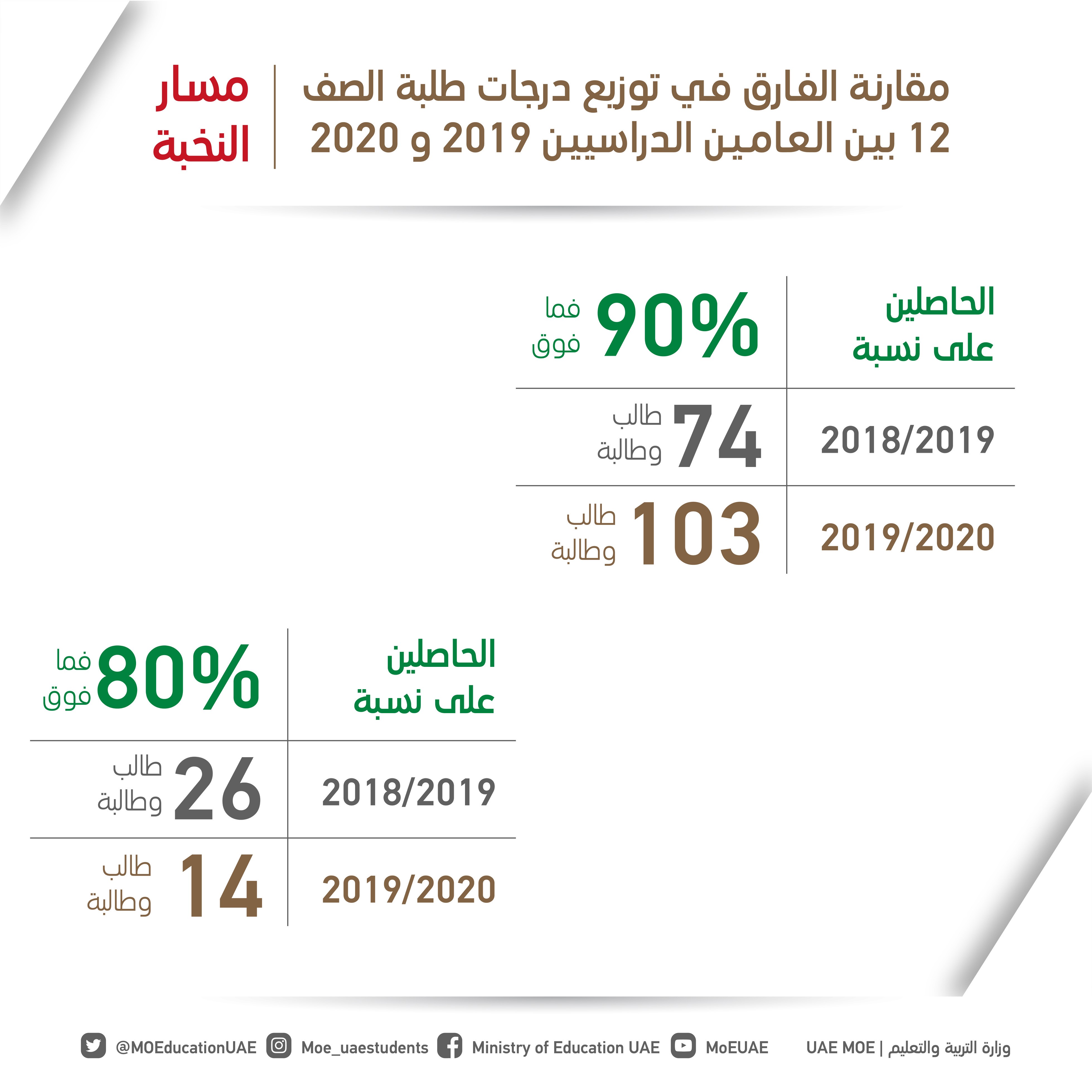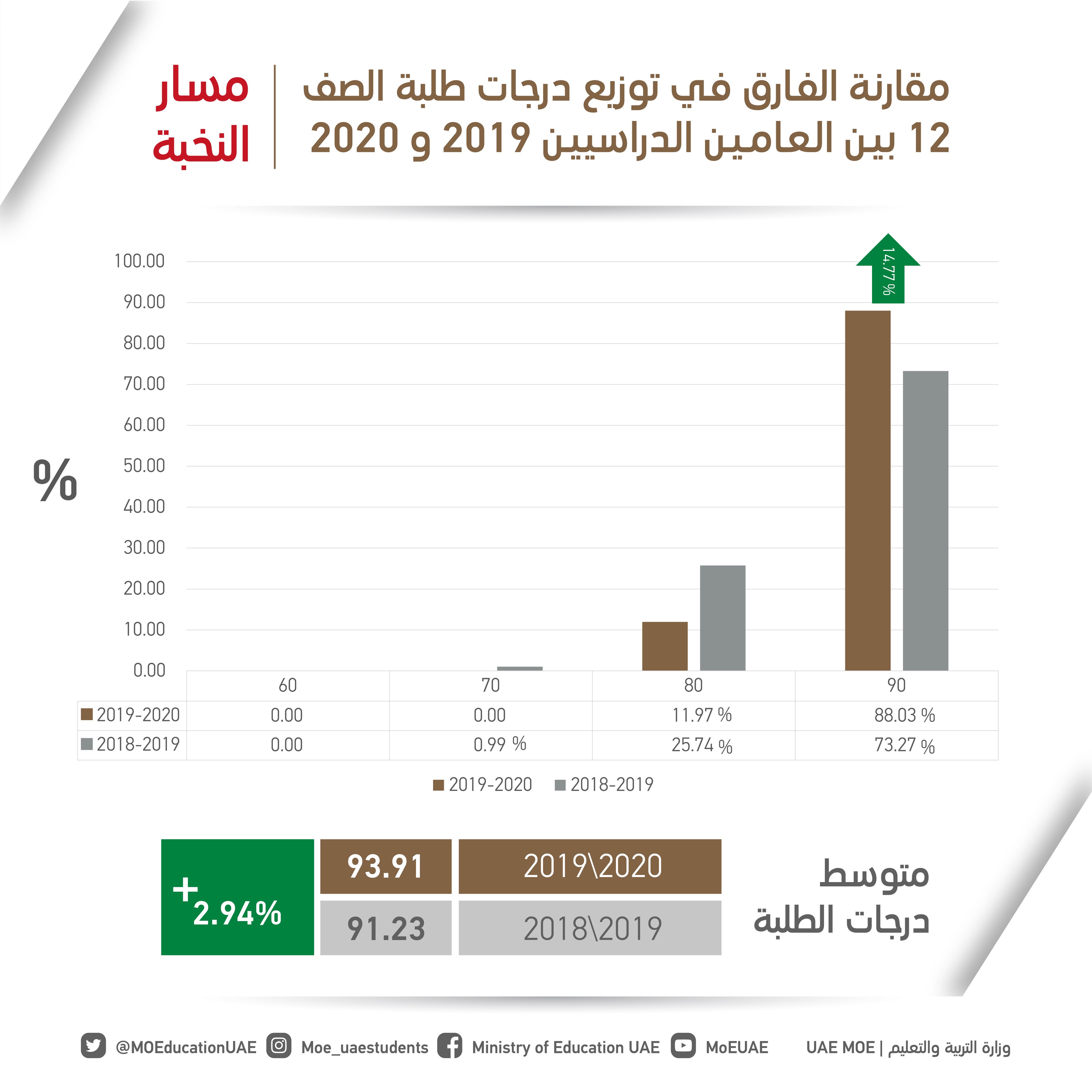 بخصوص مسار النخبة، ارتفع متوسط درجات الطلبة 2.94% ، بواقع 91.23% للعام الدراسي 2018-2019، فيما بلغ 93.91% للعام الدراسي