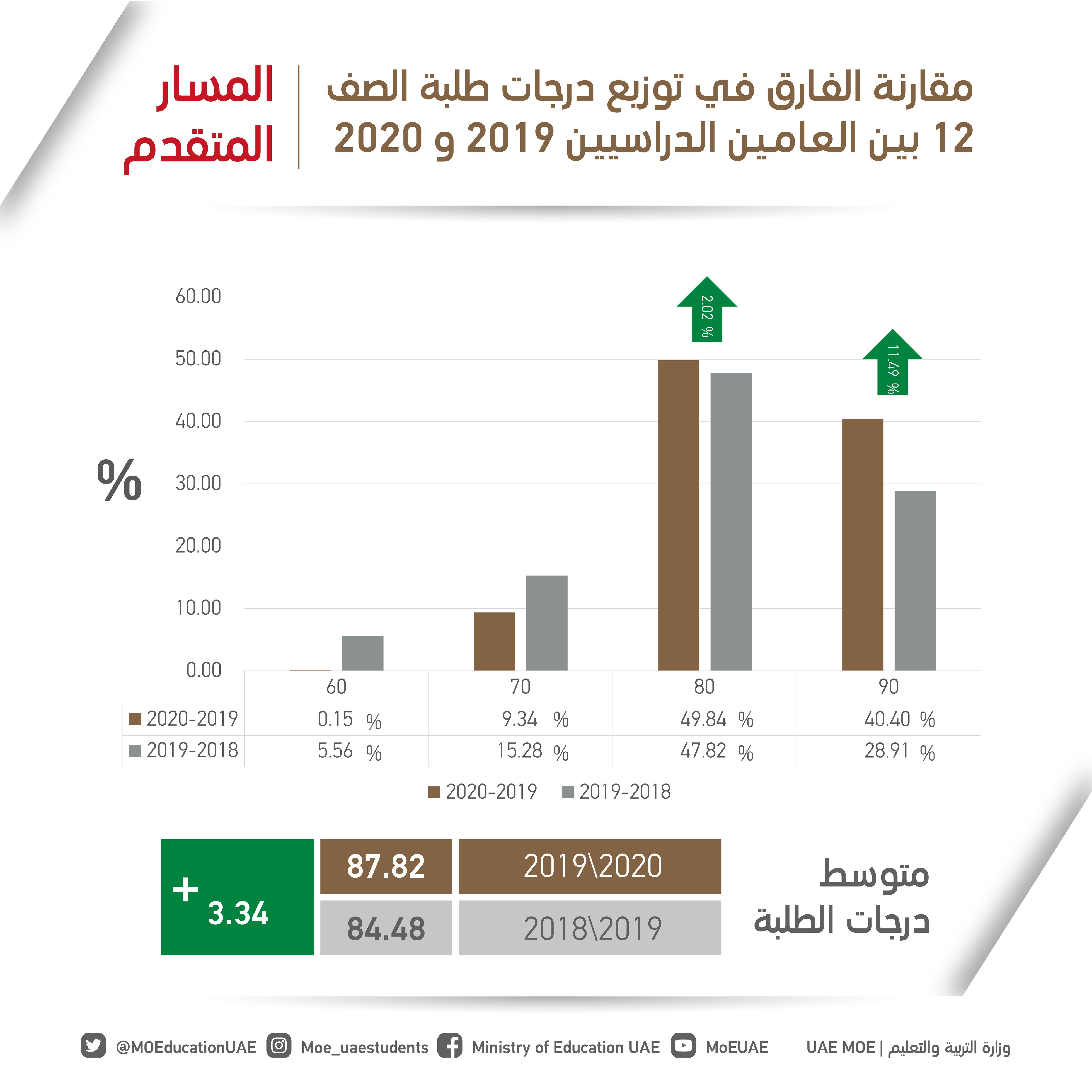أما بالنسبة إلى المسار المتقدم، فارتفع متوسط درجات الطلبة 3.43% ، إذ بلغ 84.48% للعام الدراسي